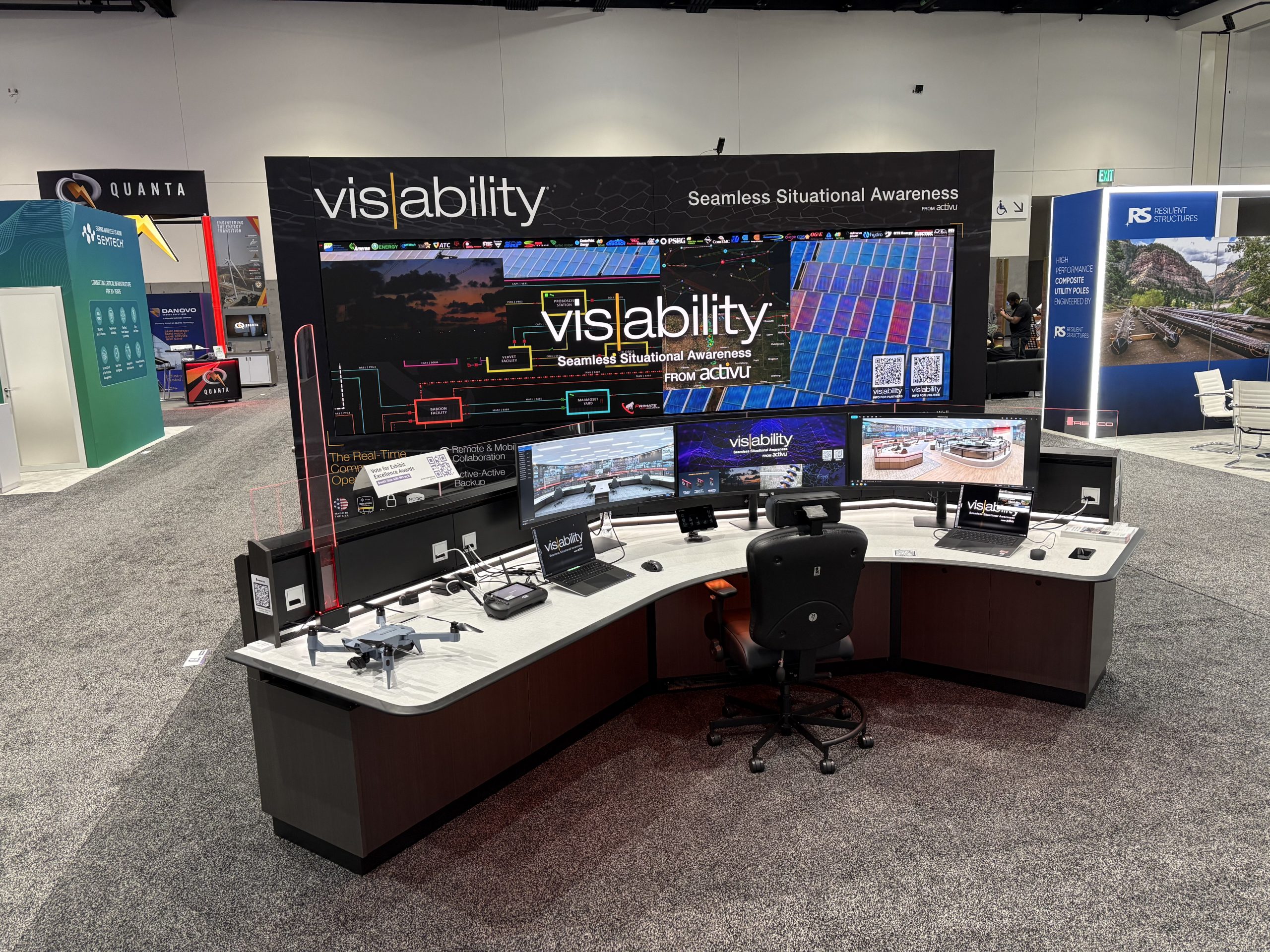 This demonstration setup of vis/ability operates exactly as it does for thousands of control rooms around the world, in the most critical functions for utilities (as is the case for this Distributech show), public safety, transportation (DOTs, airports, transit, rail), government, corporate SOCs and NOCs), manufacturing and process control, healthcare, smart cities, and more.